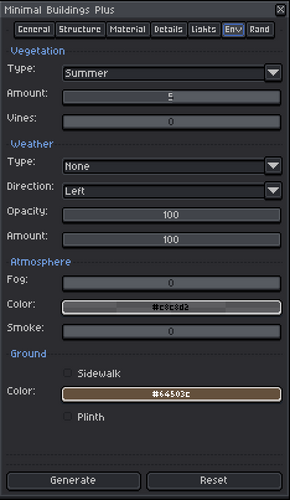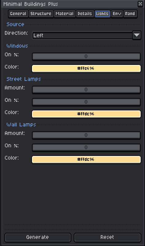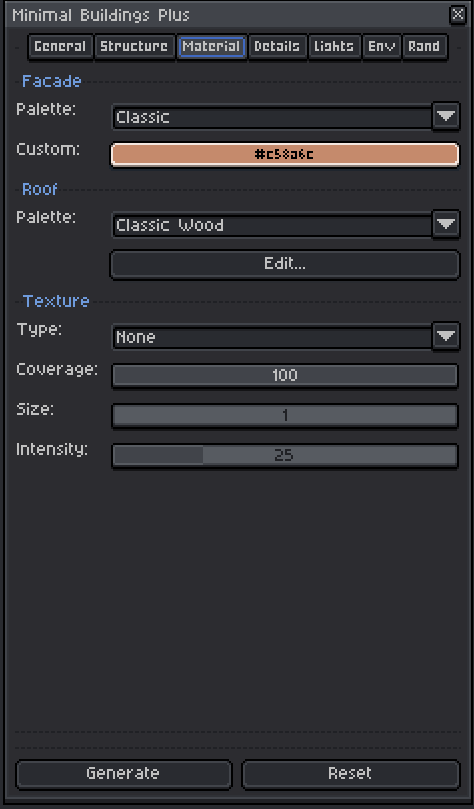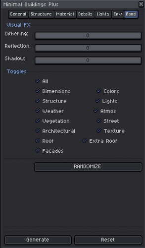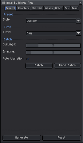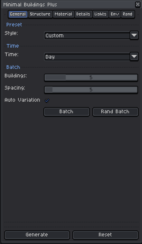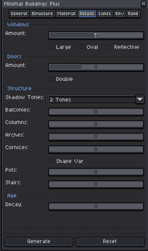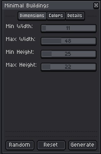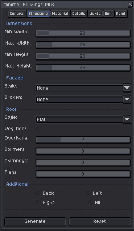 Remember: No building will ever be truly complete without your personal touch. You can always edit, adjust, and change buildings to your preference. Tips for using the script: You can start from the RND (Random) tab and generate buildings until you find one you like. Then, you can adjust the features you want until you find a building that suits your taste.