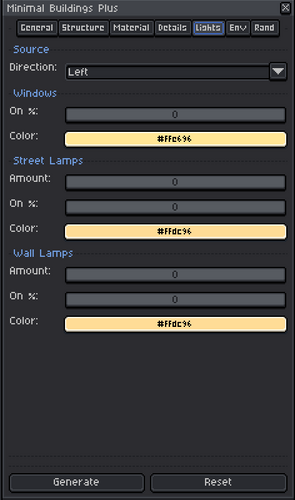 Facades automatically generate a division of light and shadow, with smooth transitions between tones. Windows are placed procedurally, never centred, adapting to the width and height of the building, with control over the number and percentage of illuminated windows. Doors are added at the base of the building, respecting the light or shadow area and avoiding overlaps.