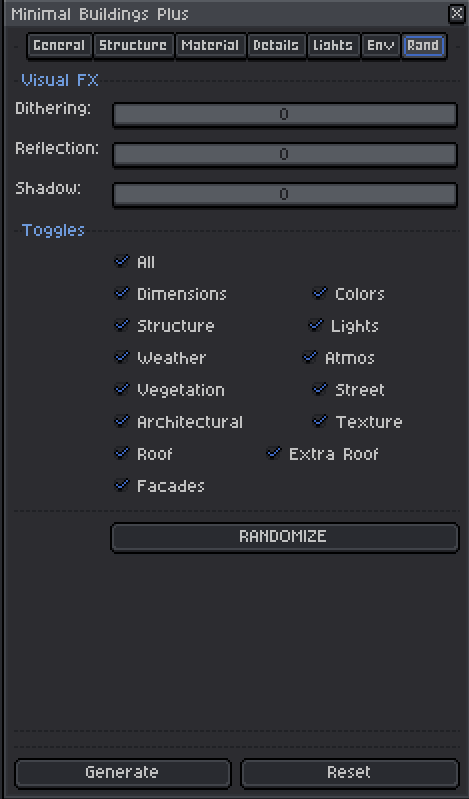 - Selective Randomization: Turn OFF specific options you want to keep consistent (like façade, colors, roof type, vegetation…) while randomizing others
